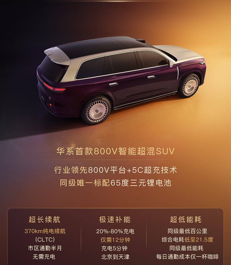 动力方面,新车搭载1.5T插混,其中发动机最大功率110kW。新车将配备65kWh电池,CLTC纯电续航为370km,综合续航1400km。并且还提供5C超快充。除此还搭载国内首发三腔空气悬架及EDC智能魔毯。
