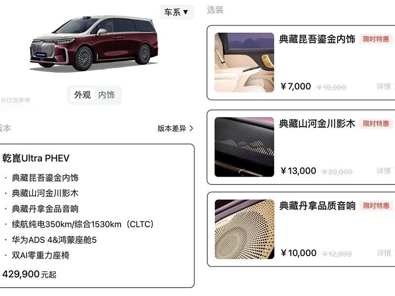 内饰方面,新车提供典藏昆吾鎏金内饰、典藏山河金川影木以及典藏丹拿金品音响可选。继续采用大尺寸中控屏搭配液晶仪表,采用七座布局,整体配置和乾崑Ultra对齐。