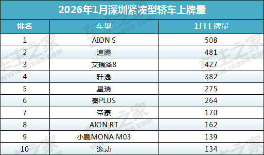 2026年1月份深圳市紧凑型轿车上牌量前十榜单