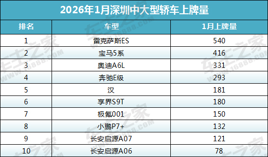 2026年1月份深圳市中大型轿车上牌量前十榜单