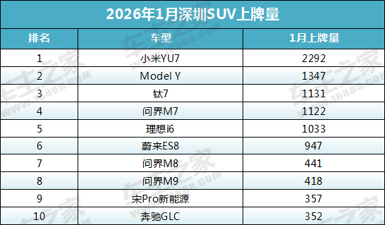 2026年1月份深圳市SUV上牌量前十榜单