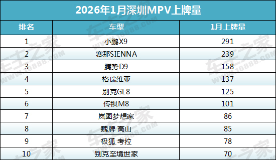 2026年1月份深圳市MPV上牌量前十榜单