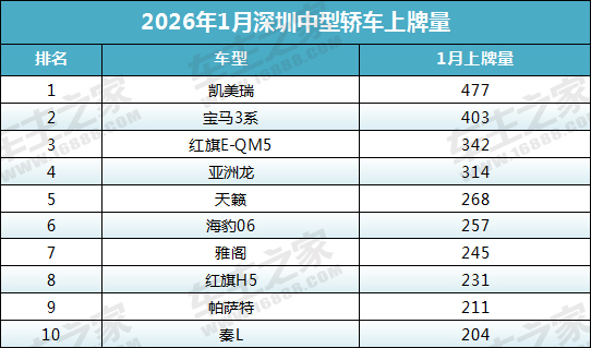2026年1月份深圳市中型轿车上牌量前十榜单