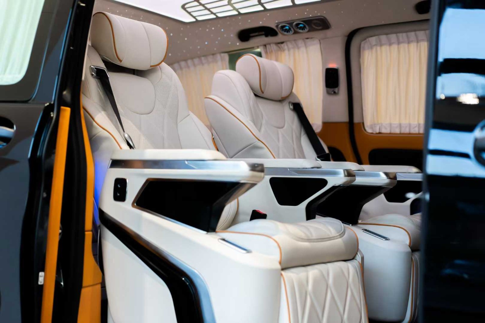 奔驰V260改装纵容的自由,满足商务接待、洽谈、出游等的需求运用,从配置上来说,2024款奔驰V260改装后座三连排电动沙发座椅,向后拓展可一键平躺变身奢华大床,商务出行可作为休憩佳所,合家出游首选。